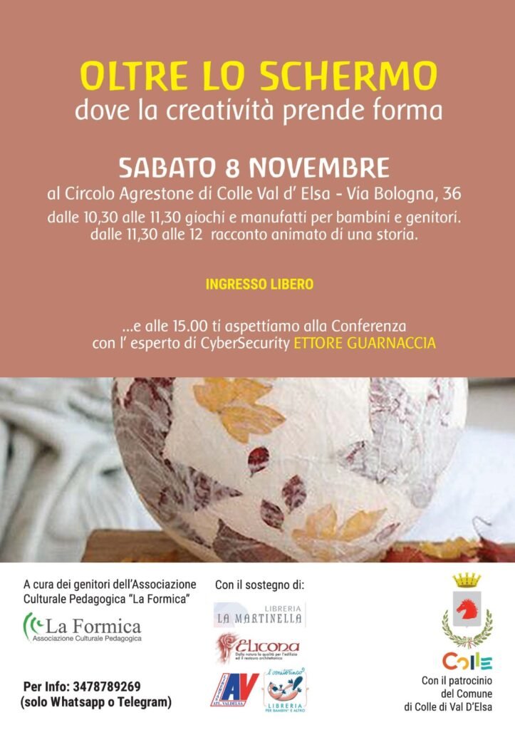 La seconda parte del mio Tour in Toscana si è svolta a Colle di Val D’Elsa con due conferenze in due giorni, ed è stata organizzata dall’Associazione Culturale Pedagogica “La Formica”. La seconda conferenza si è svolta sabato 8 novembre alle 15.00 presso il Circolo dell’Agrestone e ha seguito la prima svoltasi il venerdì presso il centro Sonar gestito dall’Associazione Mosaico. L’evento, dal titolo “Oltre lo Schermo: dove la creatività prende forma”, ha richiamato numerosi partecipanti desiderosi di conoscere il lato oscuro del digitale, che hanno riempito i locali del centro e che ne hanno animato la conclusione con diverse domande e considerazioni. Una splendida occasione per presentare il mio nuovo libro “IDIOCRAZIA DIGITALE”.