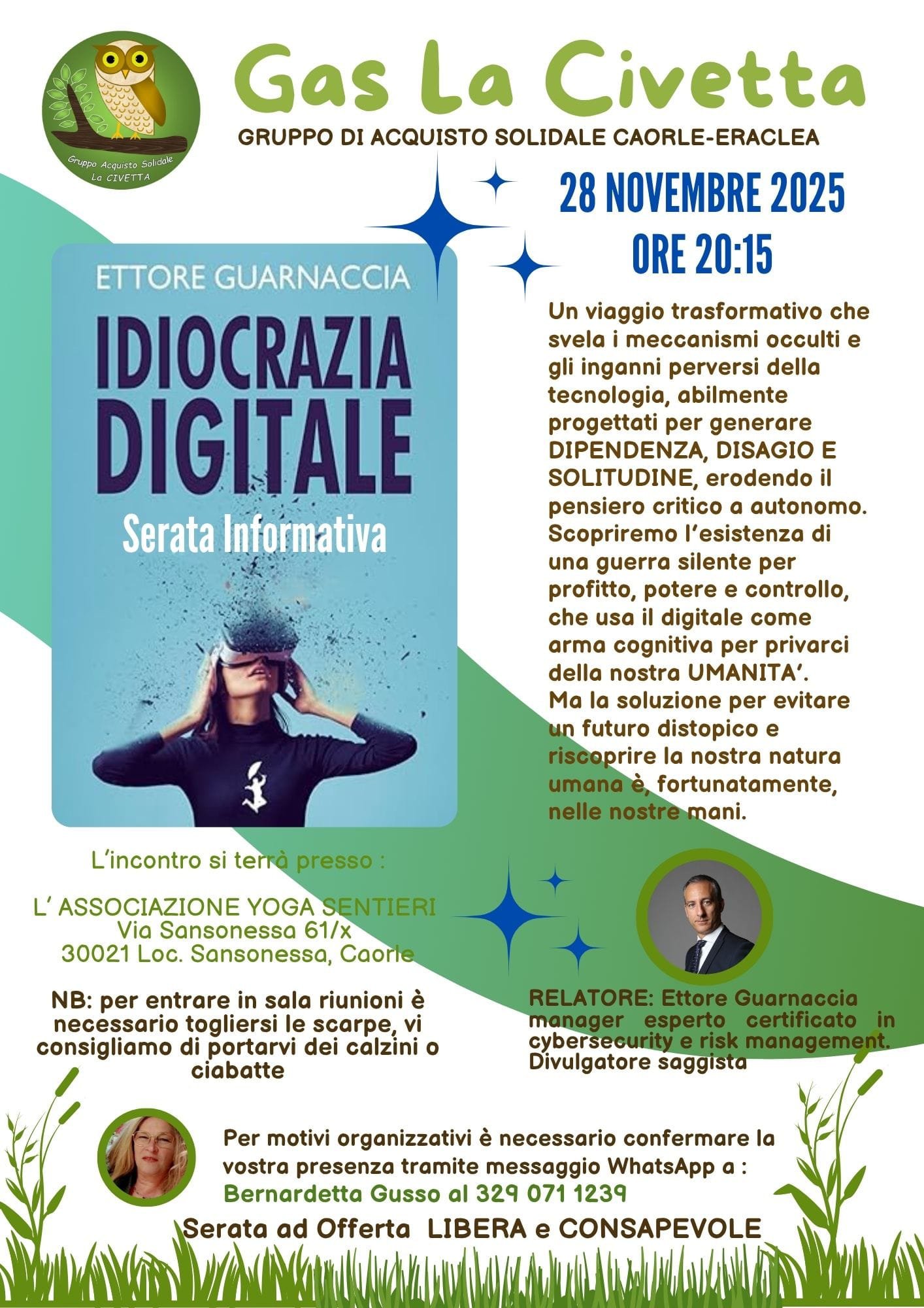 Straordinario successo della conferenza “Le Forze Nascoste del Digitale” organizzata dal Gruppo di Acquisto Solidale (GAS) “La Civetta” di Caorle ed Eraclea, che ho avuto l’onore di tenere nella sede dell’Associazione Yoga Sentieri in località Sansonessa a Caorle (VE). Una serata molto sentita e partecipata, che ha suscitato numerose domande e considerazioni.