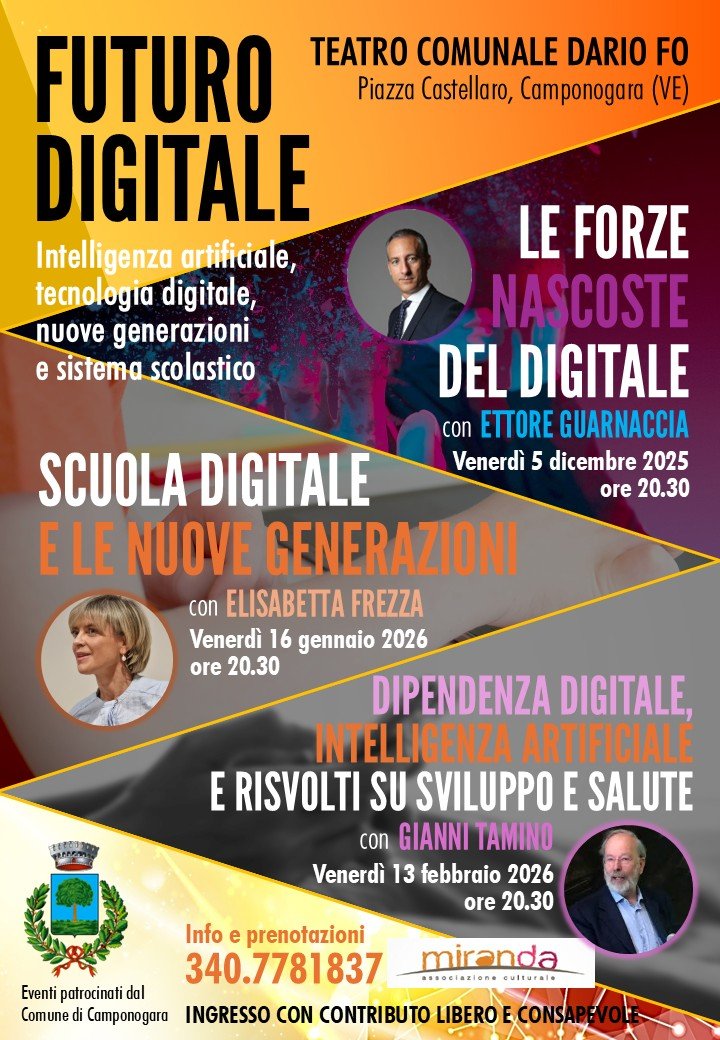 Questo evento è stato il primo di una rassegna dal titolo “Futuro Digitale – Intelligenza artificiale, tecnologia digitale, nuove generazioni e sistema scolastico” che prevede tre eventi complessivi e che proseguirà il 16 gennaio 2026 con “Scuola Digitale e le Nuove Generazioni” a cura di Elisabetta Frezza e si concluderà il 13 febbraio 2026 con “Dipendenza Digitale, Intelligenza Artificiale e Risvolti su Sviluppo e Salute” a cura del Prof. Gianni Tamino.