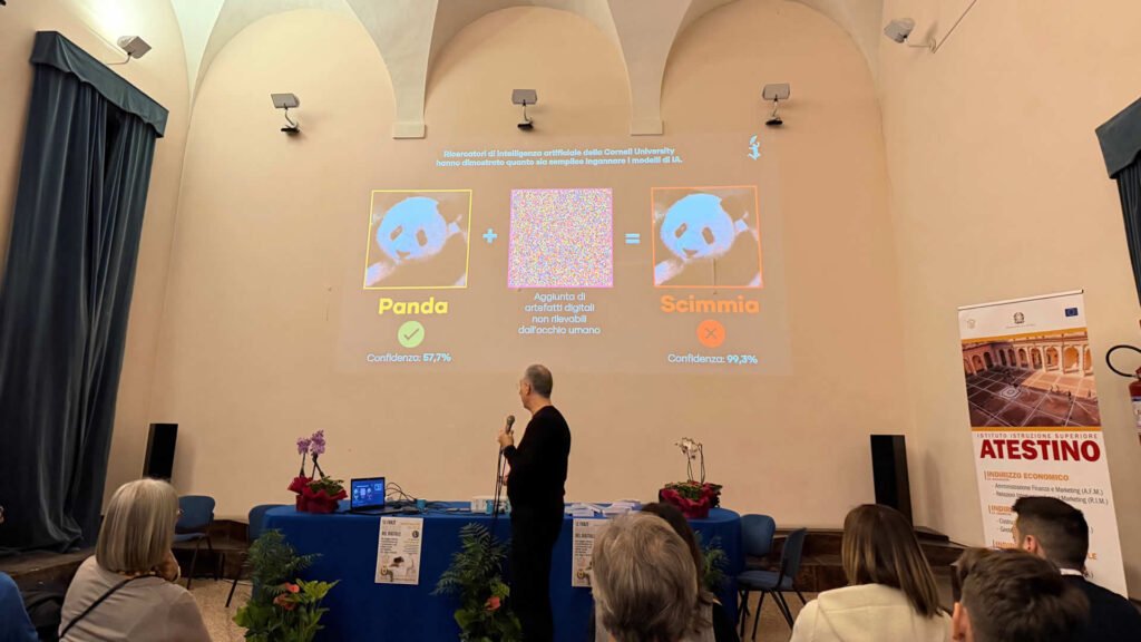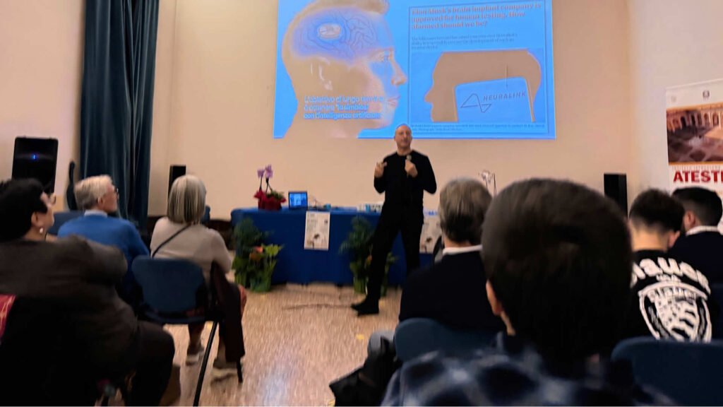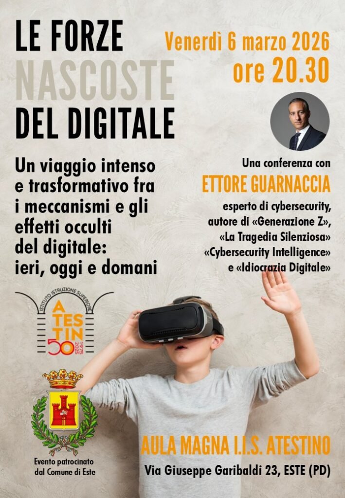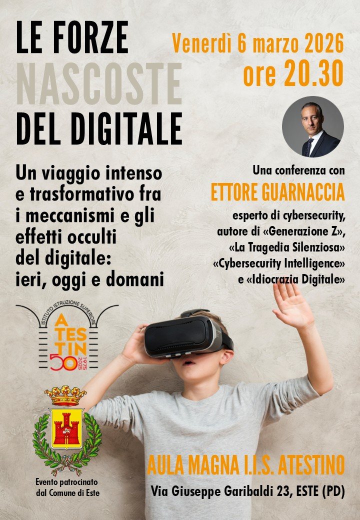 Un’altra splendida serata quella di venerdì 6 marzo nella magnifica aula magna dell’Istituto di Istruzione Superiore “Atestino” di Este (PD), all’interno dello storico edificio del XVII secolo, ex istituto “M.O. Amedeo di Savoia Duca D’Aosta, contraddistinto dal meraviglioso e monumentale chiostro di San Francesco con peristilio di scuola palladiana dell’architetto Vincenzo Scamozzi. Un nuovo viaggio tra i meccanismi e gli effetti occulti del digitale, che ha coinvolto e affascinato oltre un centinaio di partecipanti, fra docenti, genitori e ragazzi.