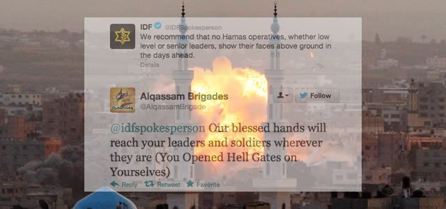 L’intensificazione del conflitto israelo-palestinese sta comunque dimostrando che le guerre del ventunesimo secolo si combattono parallelamente anche sui social network. L’IDF (Israel Defense Forces) e la frangia armata di Hamas, la brigata Izz al-Din al-Qassam, si affrontano anche su Twitter a suon di propaganda, minacce reciproche e pubblicizzazione dei rispettivi risultati militari. Tutto è iniziato il 14 novembre con il lancio dell’operazione militare israeliana tramite l’account @IDFSpokesperson, poco prima di far saltare in aria l’auto su cui viaggiava Ahmed Al-Jaabari, capo militare di Hamas, continuando poi con la pubblicazione su YouTube del relativo video e l’esposizione su Twitter e Facebook della foto della vittima con la scritta “Eliminated”. Hamas ha confermato l’assassinio del proprio leader tramite l’account @AlqassamBrigade, profondendosi poi a sua volta in minacce e atti di propaganda. Il conflitto mediatico va avanti tuttora senza sosta e può essere seguito su Twitter utilizzando gli hashtag #Gaza, #GazaUnderAttack, #Hamas, #Israel, #Palestine, #ShaleStones, #IsraelUnderFire e #PillarOfDefense.
